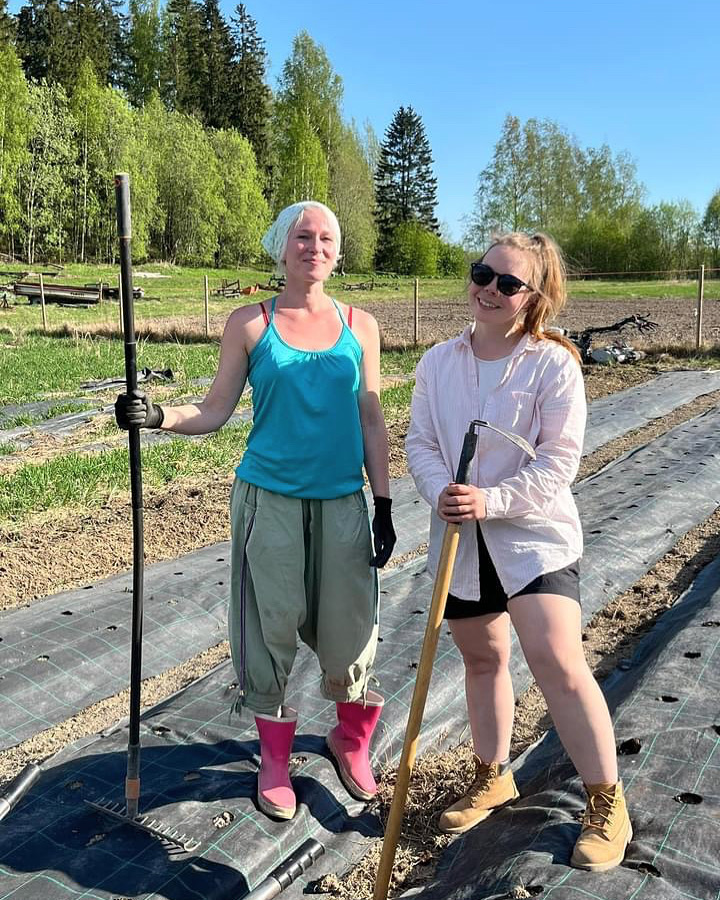 Meillä molemmilla on takana kaksi vuotta luomupuutarhatuotannon opintoja ja päätimme lähteä suoraan koulun pelloilta Korsoon kokeilemaan, kuinka suurta viljelyalaa pysymme ylläpitämään kahden hengen voimin. JUURI toimii meillä myös alustana puutarhurin ammattitutkinnon suorittamiselle, jota työstämme peltohommien ohella.